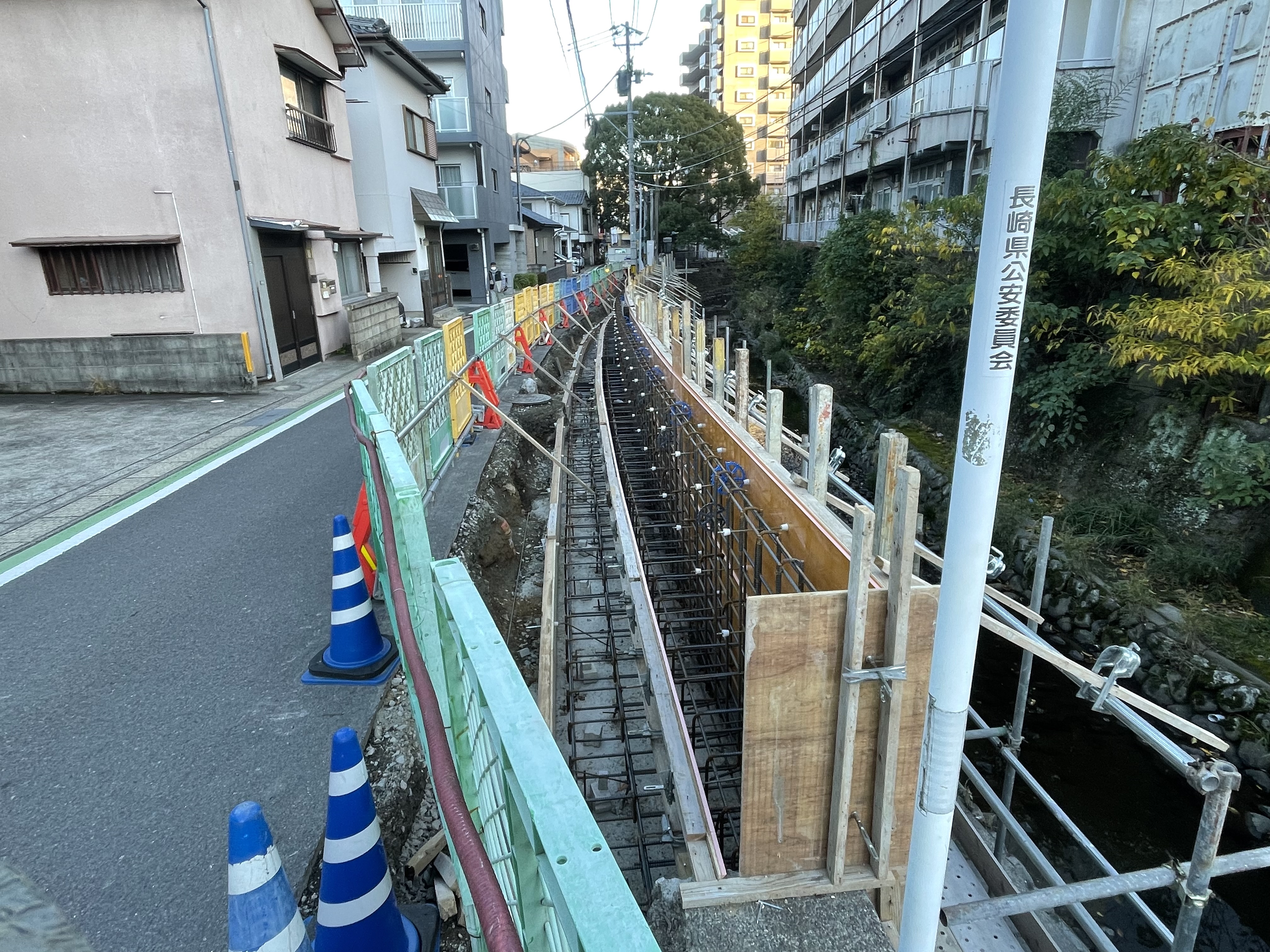 護岸のコンクリート擁壁の型枠組立、生コン打設、脱枠を弊社で行いました。